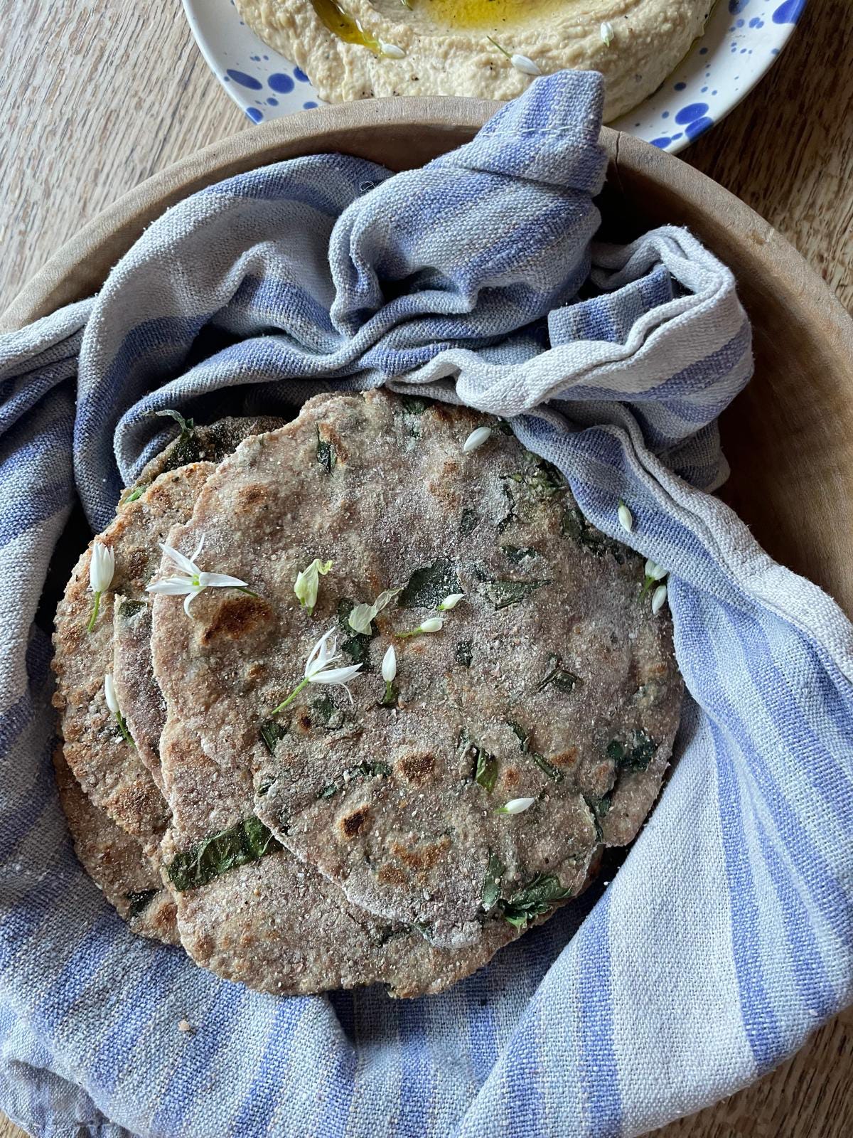 One by one, cook the flat breads for a minute or two on each side with the pan lid on. It might bubble or puff up (!) and aim for a nice colour without burning. Adjust the heat of the stove as necessary - you don’t want them to take too long, but equally you don’t want them to catch. To keep the breads warm as you cook, wrap cooked ones in a clean tea towel in a bowl.