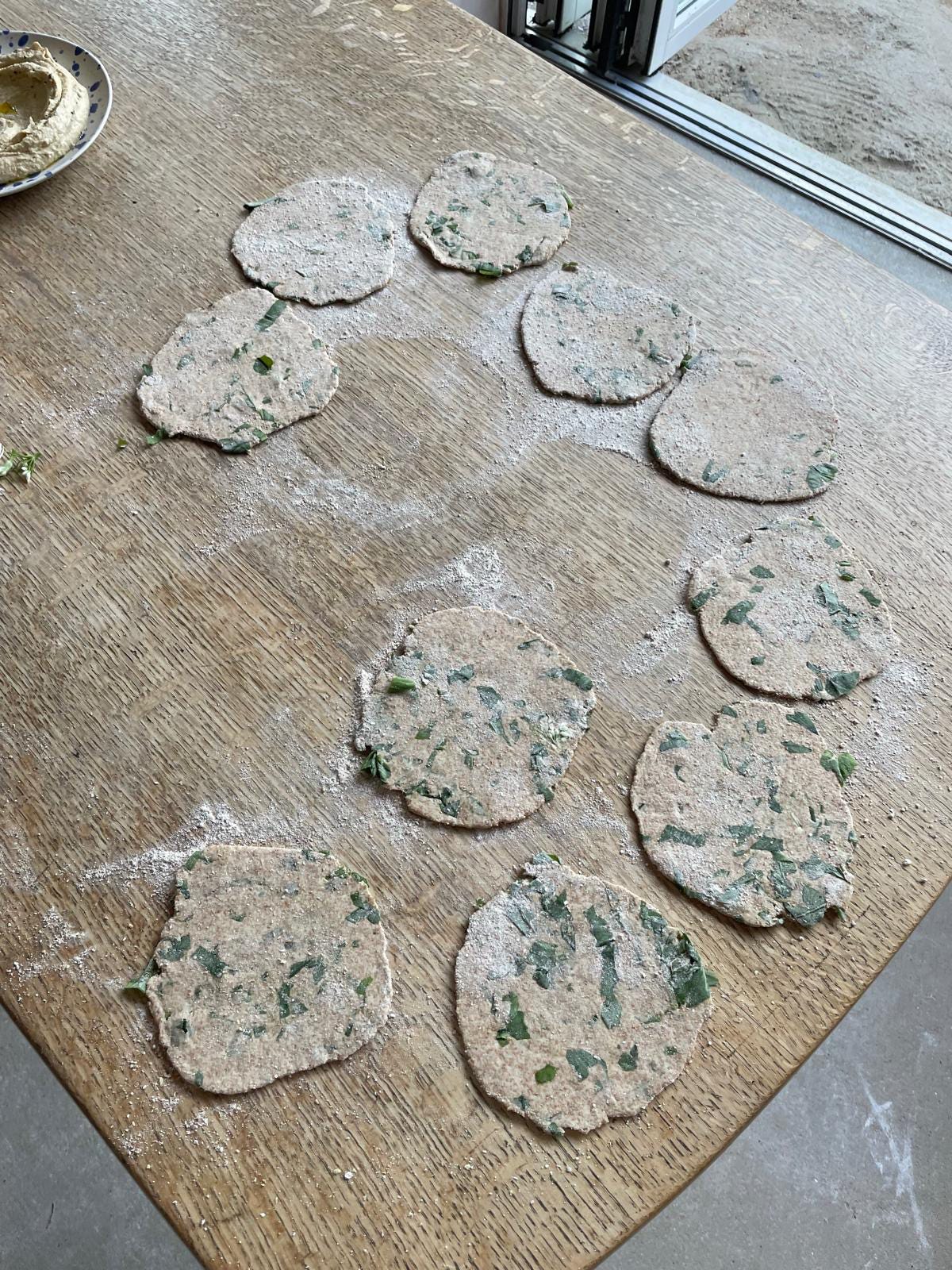 cut the dough in to 8 equal pieces and roll between palms into a ball. Using extra spelt flour, roll out all 8 flatbreads to about 2mm thick.