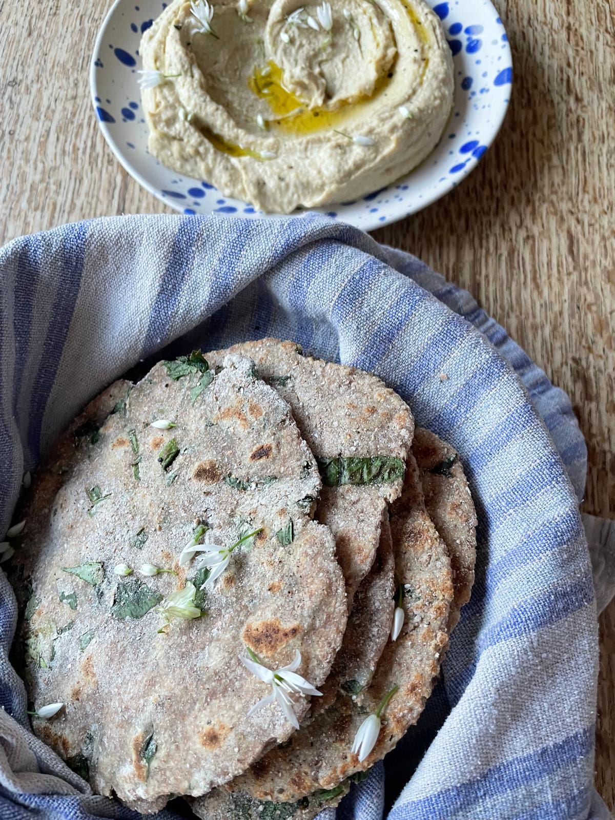 Add the Greek yoghurt to the spelt flour. Start mixing with a spoon and eventually gently knead together. Finally, add in the chopped wild garlic until just incorporated. Set to rest for 20-30 minutes.